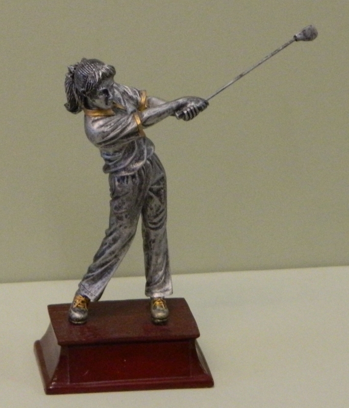 Resinfigur Golferin mit Textschild. Höhe 21cm.