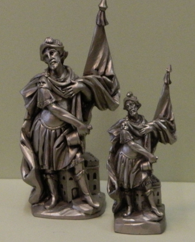 Florianfigur mit Zinnlegierung. In zwei Größen lieferbar. Durch die besondere Gießtechnik von Hand, mit feinstem Marmor, tritt eine Rohskulptur in Erscheinung. Durch hochwertigen, technischen Aufwand, werden unsere Skulpturen in Zinn von Künstlerhand fertiggestellt. In verschiedenen Patinavorgängen werden die Modelle in Ihrer Darstellung brillianter und lebendiger.