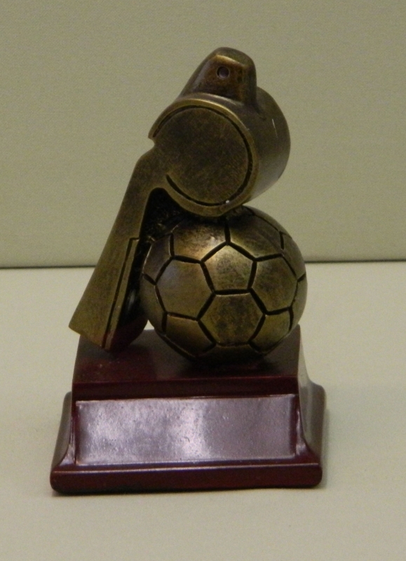 Schiedsrichter Pfeife in Altgoldfarben auf dunkelroten Sockel mit Textschild.
