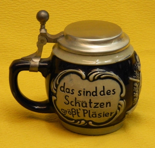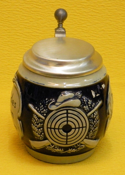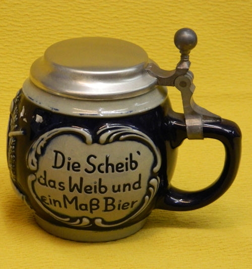Bierkrug aus Steingut mit lebensmittelechten Zinndeckel.