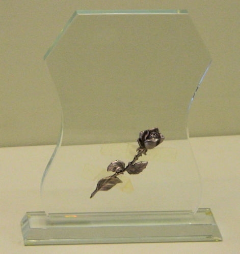 Glaspreis aus 15mm Greenfloat Glas mit Zinnrose.