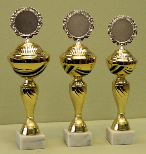 Serie in Gold/blau auf echten Marmorsockel mit Textschild.