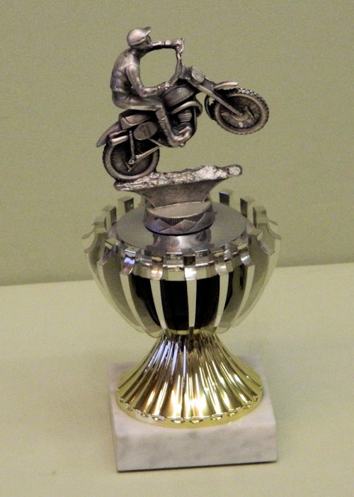 Metallfigur in Altsilber auf Kunststoff-Podest.